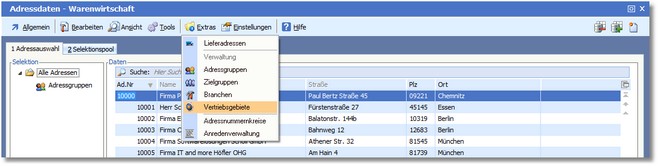 1. In der Adressauswahltabelle klicken Sie im Menü auf "Extras > Vertriebsgebiete".