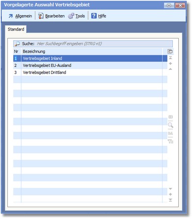 Das Programm öffnet die vorgelagerte Auswahltabelle der Vertriebsgebiete.