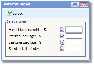 Folgende Werte dienen der Artikelneukalkulation innerhalb der Belegerfassung zur Ermittlung der Selbstkosten und werden als Vorschlag in die gleichnamigen Felder der Kalkulation übernommen: