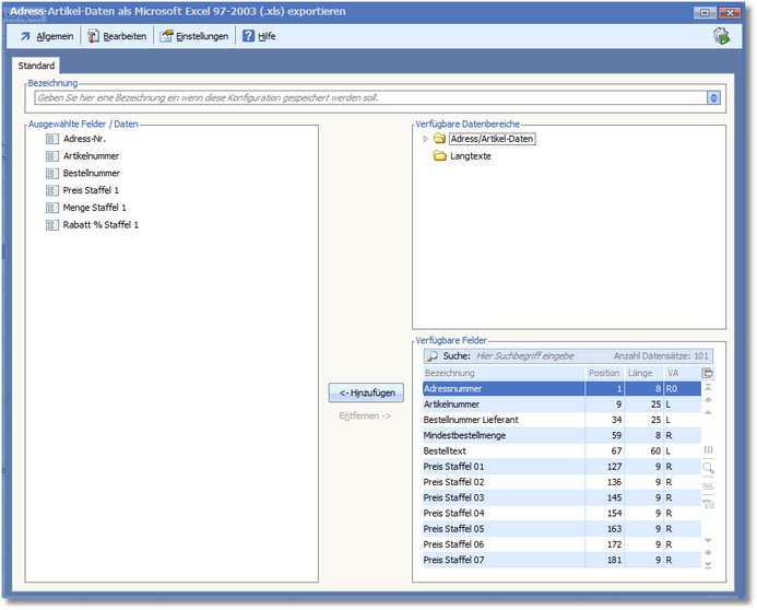 In dieser Maske können Sie die zu exportierenden Daten nach Ihren Bedürfnissen zusammenstellen, diese Einstellungen speichern und gespeicherte Konfigurationen bei Bedarf wieder aufrufen.