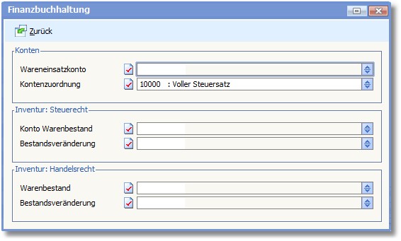 << Hier KLicken um eine Inhaltsübersicht anzuzeigen >> Navigation: Warenwirtschaft > Stammdaten > Artikelstamm > Artikelstamm - Menü > Warengruppen > Die Karteikarte "Standard" > Finanzbuchhaltung |