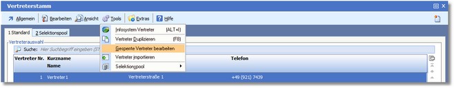 1. Klicken Sie mit der Maus im Vertreterstamm auf "Tools > Gesperrte Vertreter bearbeiten".