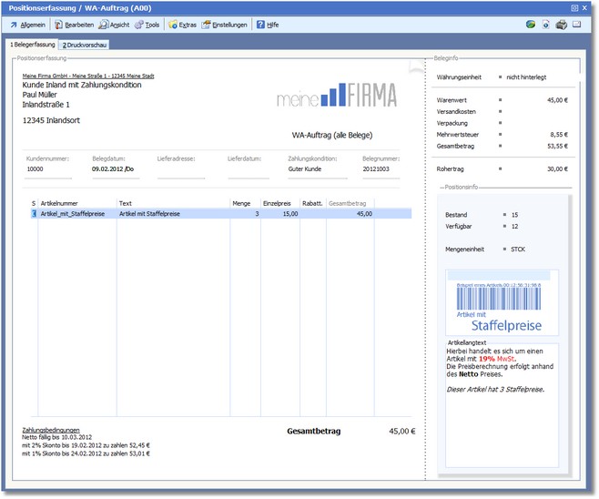 Beim Aktivieren der Karteikarte "Druckvorschau" wird eine Druckvorschau mit den aktuellen Belegdaten erstellt. Um nachträglich Änderungen an den Belegdaten vorzunehmen, wechseln Sie nur auf die Karteikarte "Belegerfassung" und nehmen Sie die gewünschten Änderungen vor.