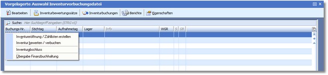 2. Mit [SHIFT]+[F10] oder einem Klick der rechten Maustaste in die Tabelle erhalten Sie ein Kontextmenü, über welches alle Programmabläufe der Inventur abgearbeitet werden können.