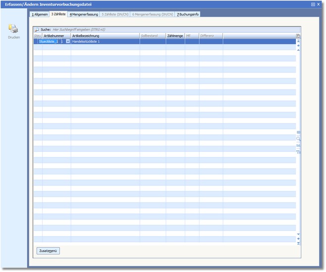 << Hier KLicken um eine Inhaltsübersicht anzuzeigen >> Navigation: Warenwirtschaft > Lagerverwaltung > Inventur > Zähllisten > Karteikarte "Zählliste" |
