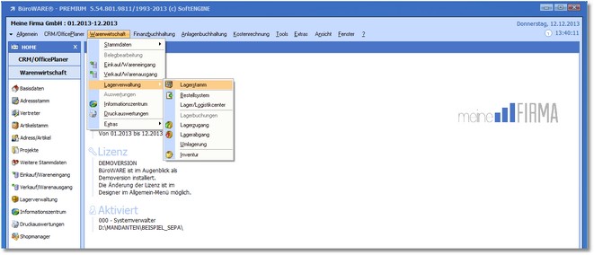 1. Klicken Sie mit der Maus im Hauptmenü auf "Warenwirtschaft > Lagerverwaltung > Lagerstamm".