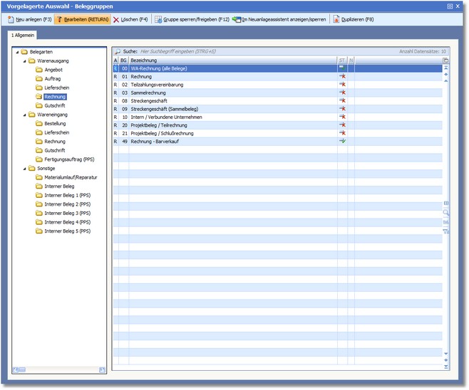 Das Programm öffnet die vorgelagerte Auswahl der Beleggruppen.