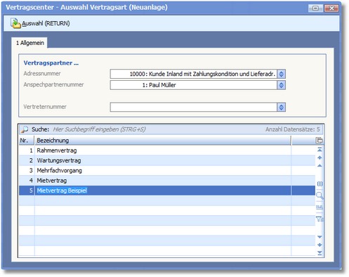 Ein neues Dialogfenster wird geöffnet: "Vertragscenter – Auswahl Vertragsart (Neuanlage)".