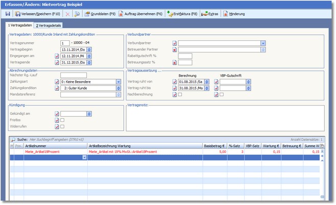 << Hier KLicken um eine Inhaltsübersicht anzuzeigen >> Navigation: Warenwirtschaft > Vertragscenter > Beispiel Mietvertrag > Dritter Schritt: Mietvertrag |