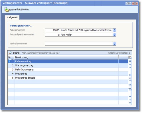 Um einen Vertrag anzulegen, wählen Sie in der Tabelle die zutreffende Vertragsart und bestätigen Sie Ihre Auswahl mit [RETURN] oder mit einem Klick auf den Symbolbutton <Auswahl>.