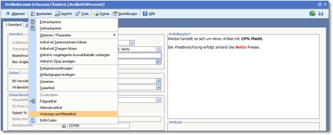 3. In der Artikelbearbeitung wählen Sie den Menüpunkt "Bearbeiten > Wartungs und Mietartikel".