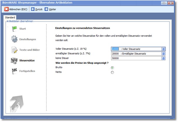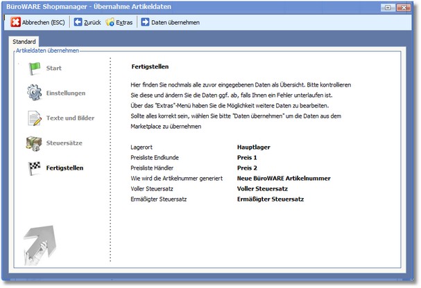 Im nachfolgenden Fenster erhalten Sie eine Übersicht, in der Sie die festgelegten Parameter zur Artikelübernahme aus dem Shop überprüfen können.
