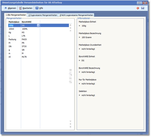 Hier wird die Zuweisung der Mengeneinheiten in der BüroWARE angezeigt und erfasst.