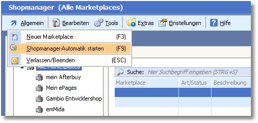 Drücken Sie [F9] oder klicken Sie im Menü des Shopmanagers auf Menü "Allgemein > Shopmanager-Automatik starten".