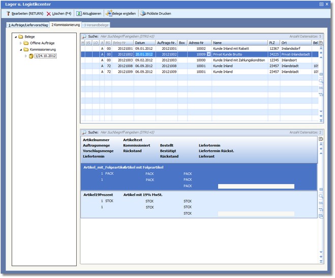 Wenn bereits frei gegebene Liefervorschläge vorhanden sind, öffnet das Programm nun den Kommissionierungsdialog im Lager- und Logistikcenter.