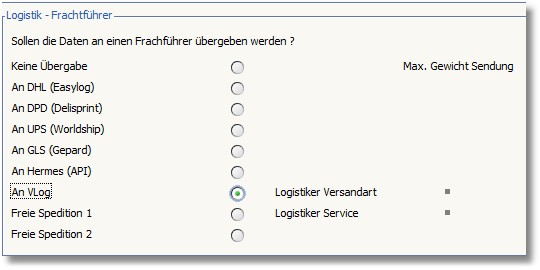 Geben Sie hier das Frachtführer Kürzel von VLog ein, mit welchem das Paket versendet werden soll.