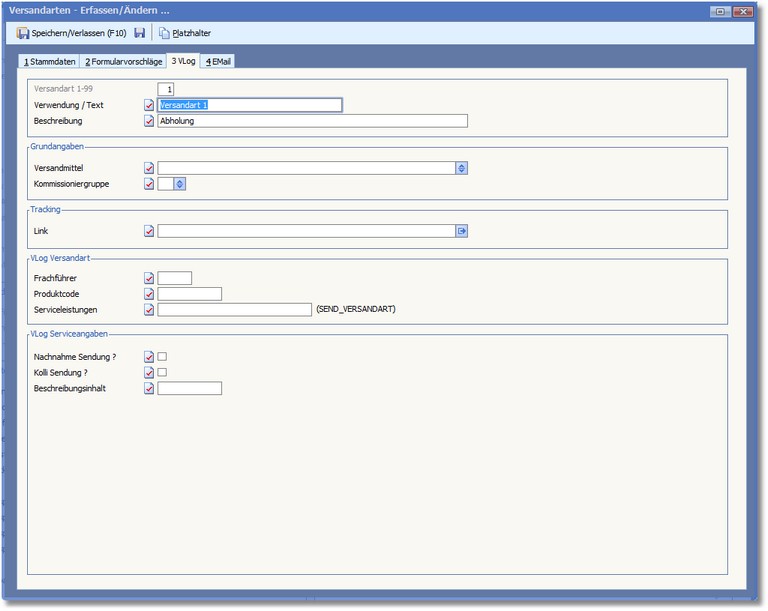 So sollten die Einstellungen einer Versandart für VLog aussehen: